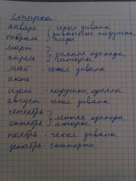 Сезонную стирку записала "от балды". Она у меня по мере необходимости. Скатерть меняю по сезону, она клеенчатая и входит в работу в зоне на 1й неделе. Одежда стирается как только сезон закончится, в позапрошлом году демисизон я убрала не в ноябре, а только в январе. В этом году лето холодное и убирала его аж в середине июня вместо апреля. Подушки/одеяла стираются летом. Единственно стоящее это чехол дивана он бежевый и требует пристального внимания. Чехлы на подушки проглядываю в 5неделе.