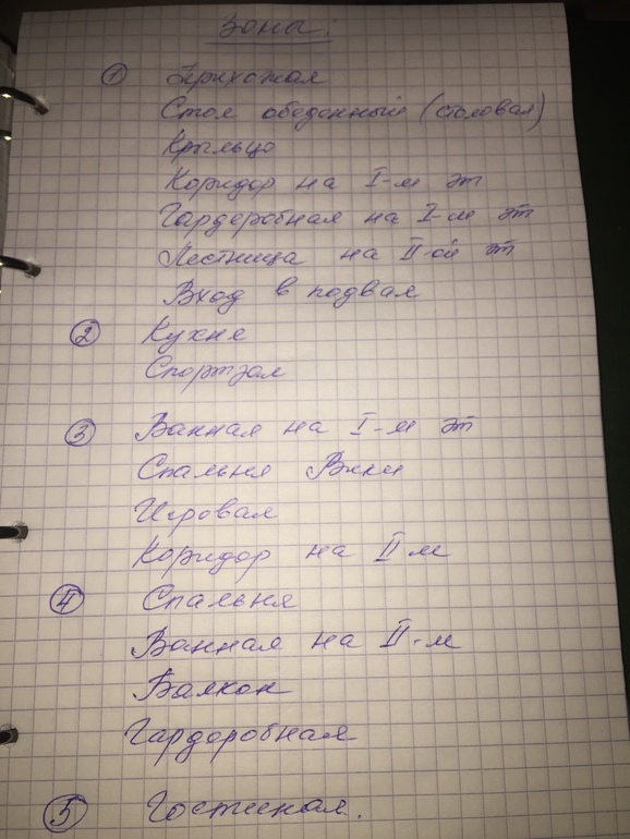 Аня, вот Ирина хорошо и ясно прозонировала: зона 1: коридор,тамбур, все двери,стол кухонный и стулья. зона 2: кухня(+окно+подоконник)стир.машинка(+место где хранится порошок и тд)полка-кладовка у кухни, шкаф с крупами. зона 3: ванная и туалет, детская, комп стол,аптечка,+хоз.запасы зона 4: наша спальня,шкаф с постел. бельем зона 5: диваны, ТВ, стеллаж с книгами, ноут. По аналогии с ней добавляй ванную№2, спортзал