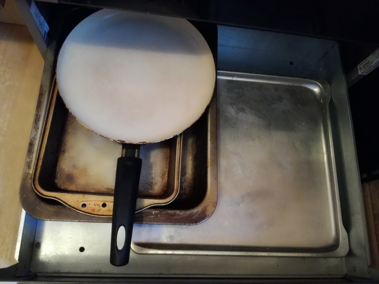 Так как некуда было ставить тарелки, пришлось с нижней полки выселить утятницу, придумала место только в ящике внизу плиты, на фото мои позорные протвини, девочки посоветуйте хорошие протвине, которые не испортятся через месяц, как эти ( сейчас пользуюсь ими стеля на дно фальгу) ????