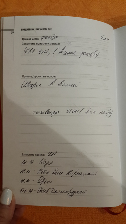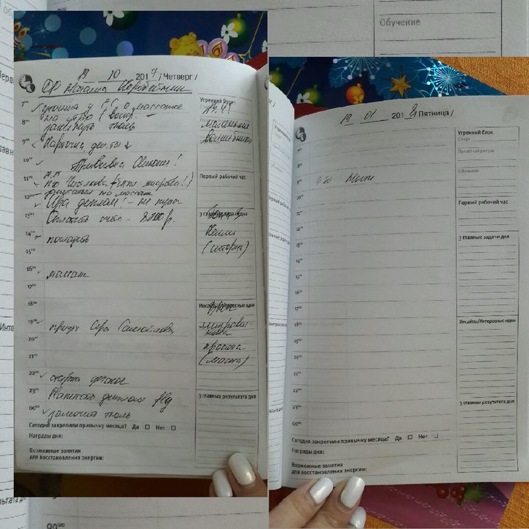 Ежеднев не датирован - пишем что хочем и когда хочем. В воскреснье - понедельник утром я расписываю основные неизменные моменты на неделю (кружки - секции, БНП, Зоны), а вечером я просто прикидываю планы на день. Вот, как предлагал заполнять страницы автор, и как заполняет их флаюшка))