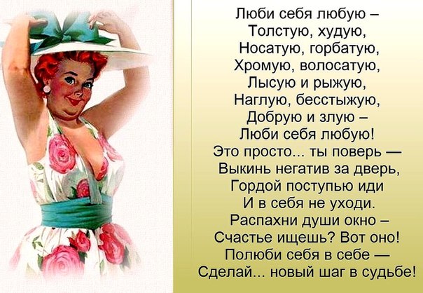 Теперь открываем свой КЖ, открываем пустую страничку, и пишем - Я люблю себя за...не менее 50 пунктов!! Самые мелочи! Все все! Есть такое классное упражнение - вы в этом списке еще обязательно укажите "перевертыши" из первого списка. Например, вы написали - не люблю себя за толстую попу = люблю себя за женственную фигуру, не люблю за жесткость с людьми = люблю за сильный характер, не люблю за лень = люблю за то, что позволяю себе расслабиться, не люблю себя за то, что злюсь на детей - люблю за то, что могу выплеснуть эмоции и т.д. На любую совершенно фразу или ситуацию можно найти такой вот перевертыш, поверьте! И уже кажется, что не так уж все плохо, правда))) И почаще перчитывайте этот списочек, дополняйте!!
