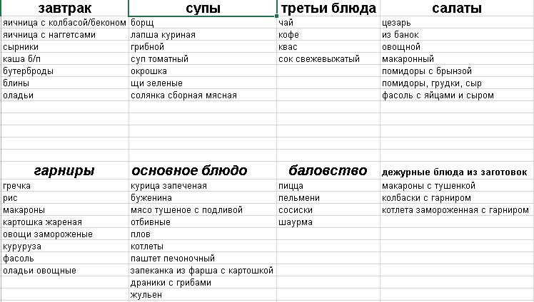 - прежде, чем составлять меню, напишите на листочек то что умеете готовить.
