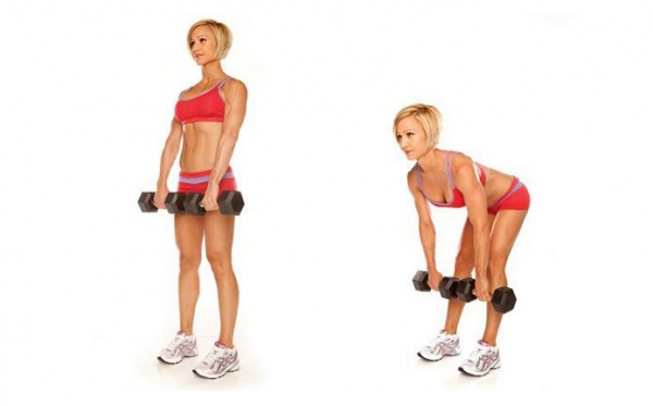 3. Наклоны. ИП стоя, ноги на ширине плеч, немного согнуты. Руки с утяжелителями расположи на передней части бедра. Отводя ягодицы назад, наклоняйся вперед. Напрягай ноги и мышцы кора. 12-20 раз.