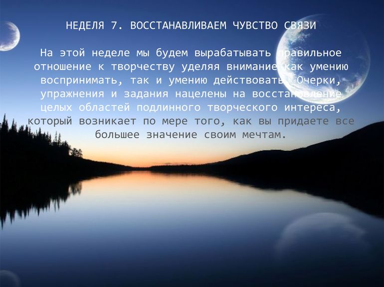 Привет еще раз) На самом деле я честно читала книгу путь художника но задания увы не делала (за время отсутствия) но! во-первых, первая фраза мне почему то не нравится, вернее я понимаю что заботиться о себе надо, но.. пока никак не придумаю фразу чтобы она мне урчала) про остальное: как раз на той неделе я действительно стала чаще слушать музыку) купила себе аж два новых платья и заказала обувь на примерку - жду заказ) также была на даче и были минуты но почти уединения - я даже себе видео записала - звуки птиц)) фильмы назвала - романтика и материнство, сочинения более обширная тематика, а вот с коллажом засада - как то дома журналы не держу, не знаю, как выполнять это задание.