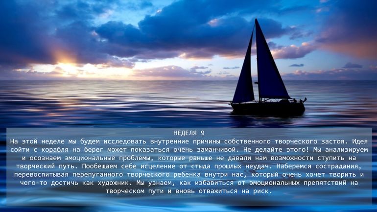 1. Начала читать я свои утренние страницы, но до конца еще далеко. Пока что никаких светлых мыслей там не было, бытовая тарабарщина. В начале воспринимала УС, как некую форму дневника и писала о дне сегодняшнем-вчерашнем. Негатива немного, но, как ни странно, от него сейчас избавилась даже без положительных переворотов, просто надоело об этом писать, потом думать и что-куда делось. Знаю, что светлые мысли будут (точно помню, что писала), но пока до них добраться не успела. Читаем дальше)) 2. Мой север - развитие и семья. Я точно знаю, что мне не нужны ни слава с признанием, ни деньги, как таковые. Я точно знаю, что теперешнее мое увлечение может смениться в любой момент. А точнее поменять русло. И вот я уже известный блогер, писатель и учитель, но я ищу чего-то нового. То, что я еще не изучила, то, что я еще не познала, то, где я еще могу себя применить, тех, кому я еще могу помочь ощутить тот вкус жизни, что ощущаю я благодаря своему труду и своему творчеству. 3. Приоритет номер раз: блог. Продолжаю регулярные публикации не менее трех раз в неделю. Добавляю больше чувственности и личного примера в публикации. Приоритет номер два: проза. Каждый день пишу столько, сколько могу, но не менее часа в день. Приоритет номер три: зарабатываем денежки. Написать и выставить на продажу серию статей о каркасных домах. Ищу информацию и пишу каждый день. 4. Творческие развороты по писательству: Башня, Летопись послесмертия, Мастер крыла, Попробую эротику, Світ. Мой мега-разворот - это Світ. Мне было тогда лет 19. Работала секретарем в учебном отделе университета, где училась заочно. Начала писать произведение, одна из сотрудниц заинтересовалась. Дала ей почитать. Ей понравилось и очень. Она пообещала познакомить со знакомым редактором, чтобы по завершении книгу опубликовали. Догадайтесь, что я сделала?... Довести этот разворот до ума вряд ли получится: думаю уже по другому и тот мир от меня далек, но у меня есть еще недоделки. Благо они никуда не делись и не потерялись. Дело за малым. Написать)))