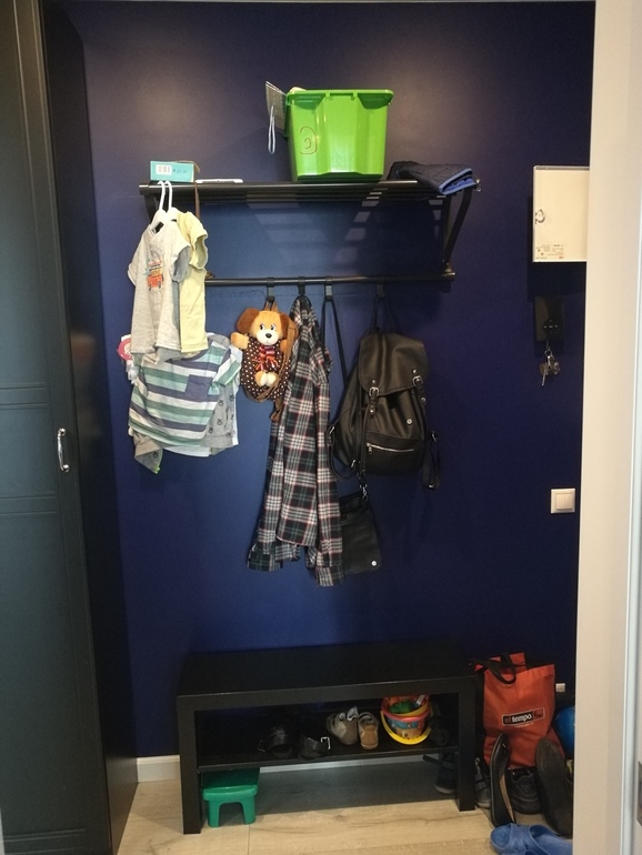 Регулярно в коридоре лавочка завалена всем подряд, сейчас опять таки все в относительно приличном виде, не считая печенек наверху, разбросанной обуви и одежде развешанной как в магазине😂нам пока так удобно)