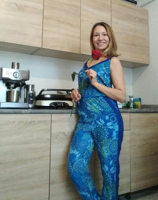 2. Я и правда блистаю - выбрала для дома летний в меру нарядный и очень удобный комбинезон+на спине декольте😎, выходила в нем на прогулку с ребятней) днём накрасилась, добавив небольшие стрелки в макияже глаз, муж розочку подарил😍