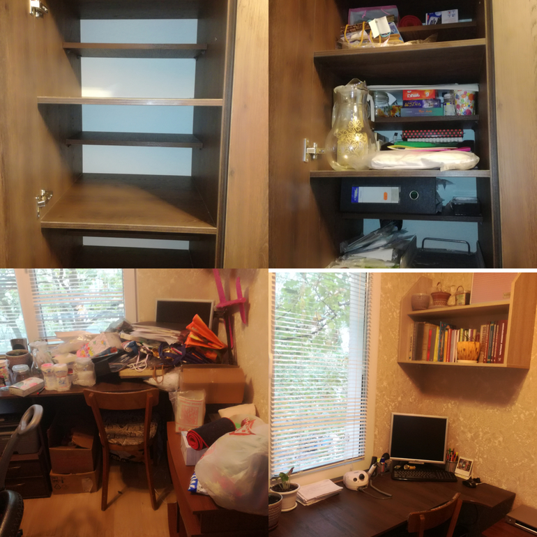 Что я сегодня делала: муж вставил между полками в шкаф дополнительные короткие, перед чем мне пришлось все вывалить себе на стол и естественно потом поставить назад, заодно расхламив:)