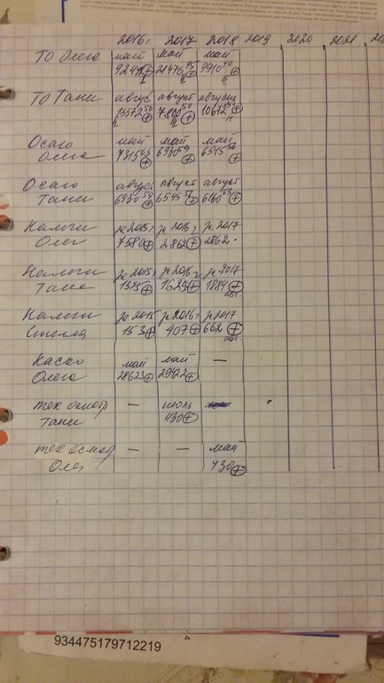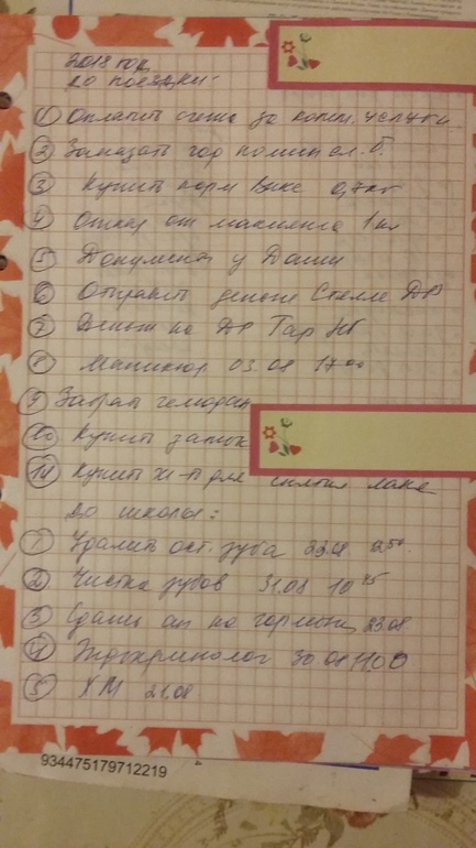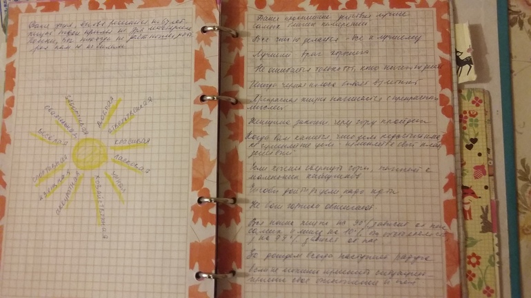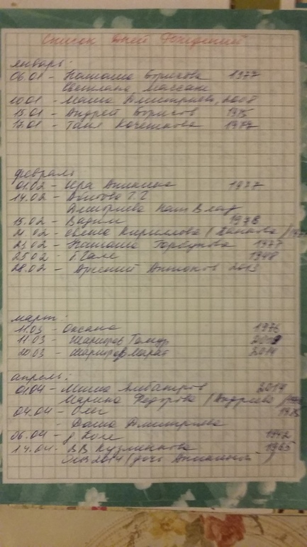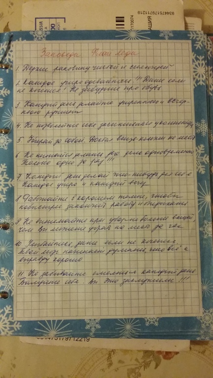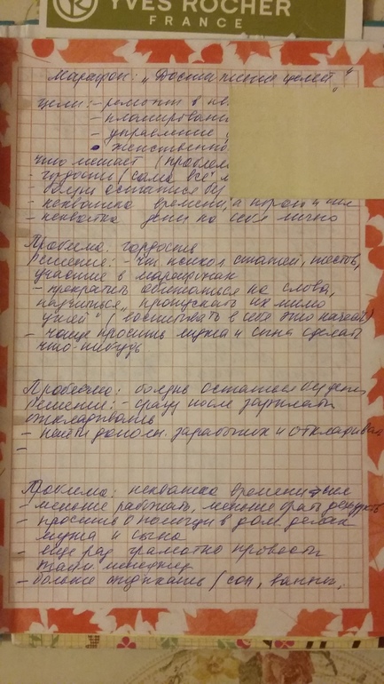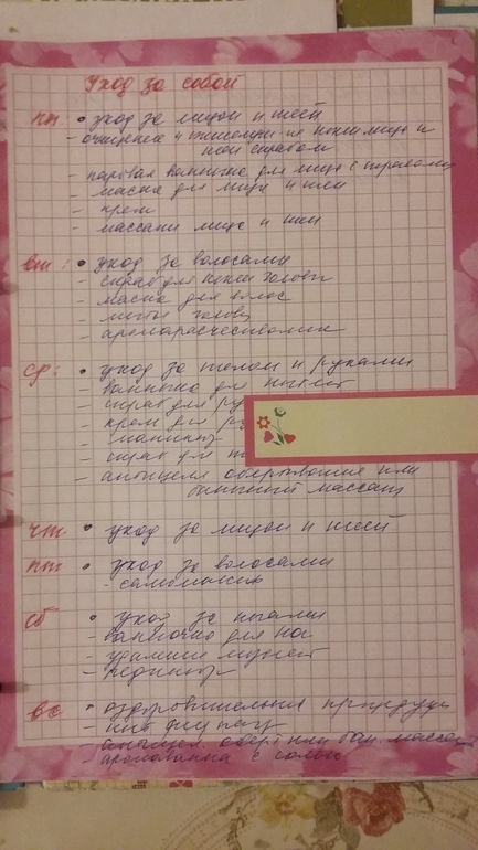 Все без особой красоты, максимум красная ручка для заголовков и выделения нужных вещей. Поменялся месяц, берем другой лист и т.д.