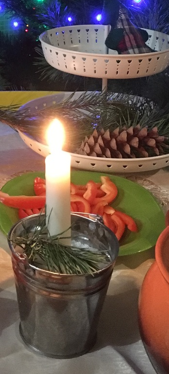 Свечи у нас самые простые, зимой делаем так: в маленькое ведерко насыпаем соль, вставляем обычную свечку, украшаем еловыми иголочками.