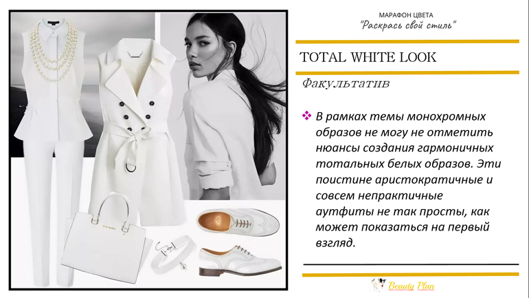 Белый цвет, как один из нейтральных цветов, сочетается практически со всеми другими цветами.Но при этом создать гармоничный тотальный белый образ достаточно непросто. И даже дело не в том, что необходимо подобрать свой оттенок белого цвета,а в том, что нужно учитывать ряд очень важных нюансов для создания потрясающего образа в стиле total white.