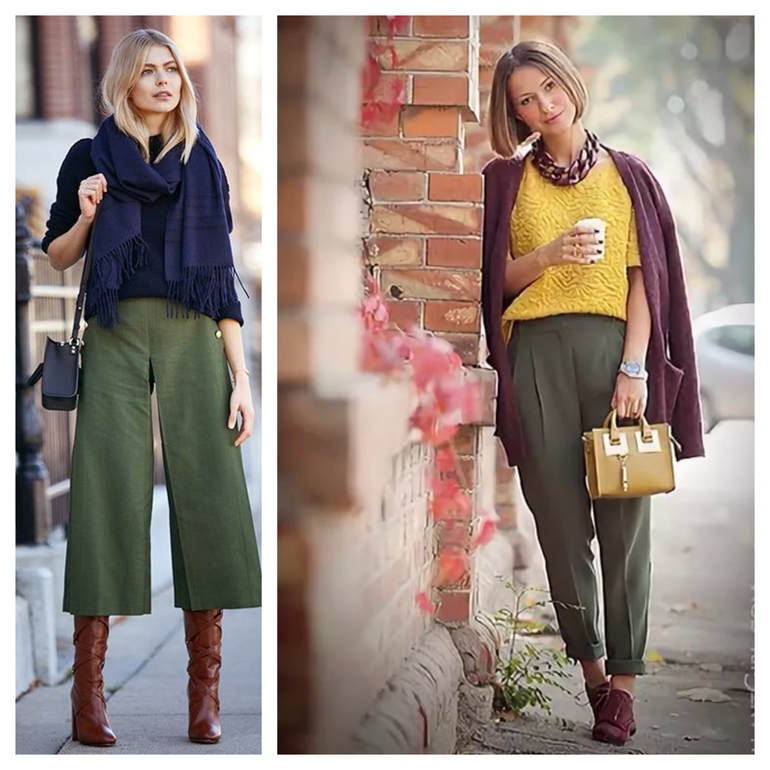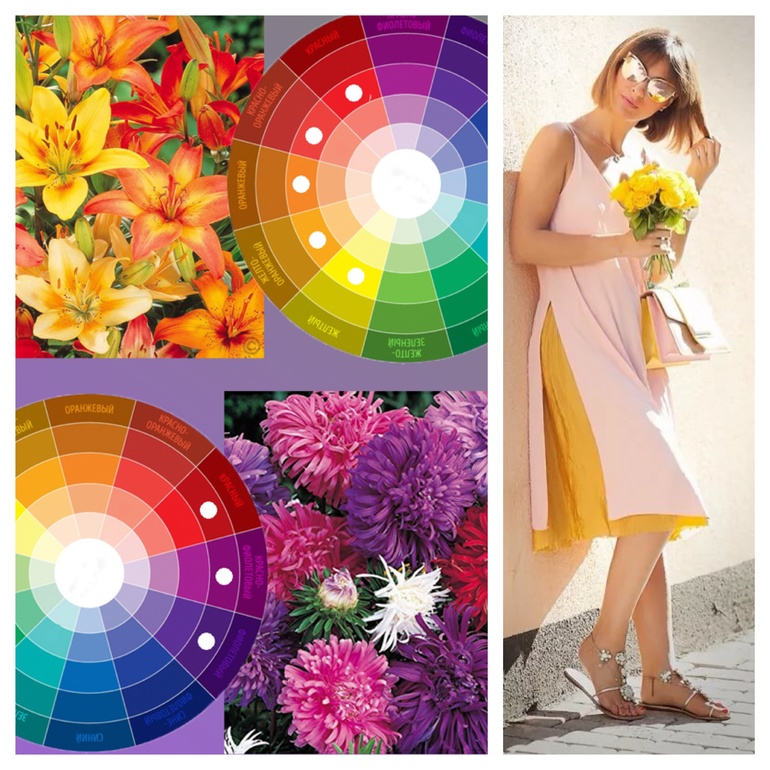 ✍️Лучше всего аналогичные цвета использовать как основные (75% в комплекте), а противоположный контрастный цвет в качестве узора, принта или аксессуара, то есть в небольшом количестве (25% максимум). Но и в равных пропорциях трех цветов образы могут смотреться очень не плохо (второе фото коллажа).