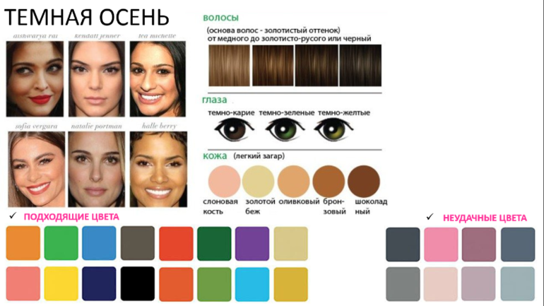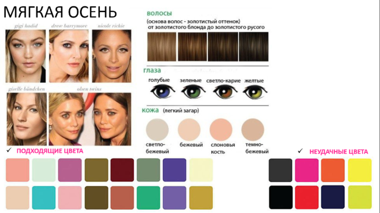 Осень - это золотая пора. Вот и девочки с цветотипом Осень имеют рыжие вплоть до красных, искристо-каштановые или русые волосы, мерцающая золотистым отливом кожа, легко поддающаяся загару, глаза теплых оттенков. Такая внешность очень теплая и располагающая. Осень подразделяется на Мягкую, Теплую и Темную осень.