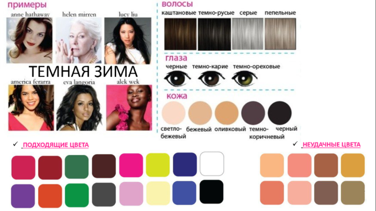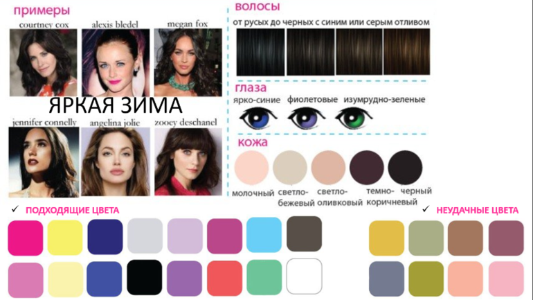 Такая внешность построена на контрастах. Основная особенность цветотипа Зима - это холодные краски и высокая контрастность внешности. Наиболее подходящую гамму для заданного типа диктует нам сама природа - это черно-белые, бело-красные и все оттенки северного сияния. Зима подразделяется на три подтипа - Темную, Холодную и Яркую зиму.