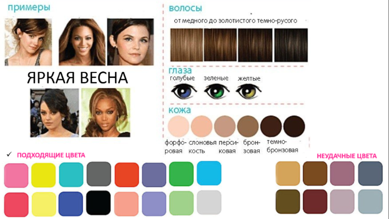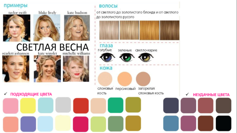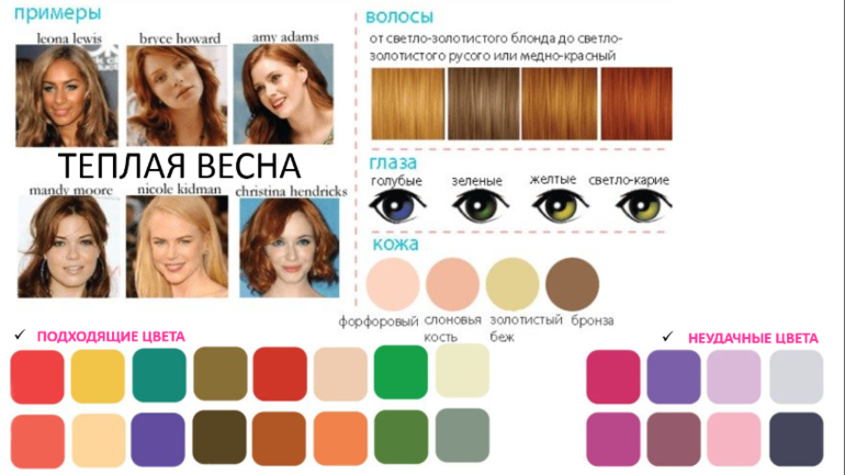 Обладательница данного цветотипа обладают деликатной, почти прозрачной кожей с небольшими участками румянца на щеках и подбородке. Коньячные, золотые, ржаные или светло-каштановые волосы дополняют весенний образ. Глаза у Весны исключительно светлые - голубые, серые, зеленые, светло-карие. Брови и рестницы светлые, губы теплых оттенков. Весна подразделяется на Яркую,Теплую и Светлую.