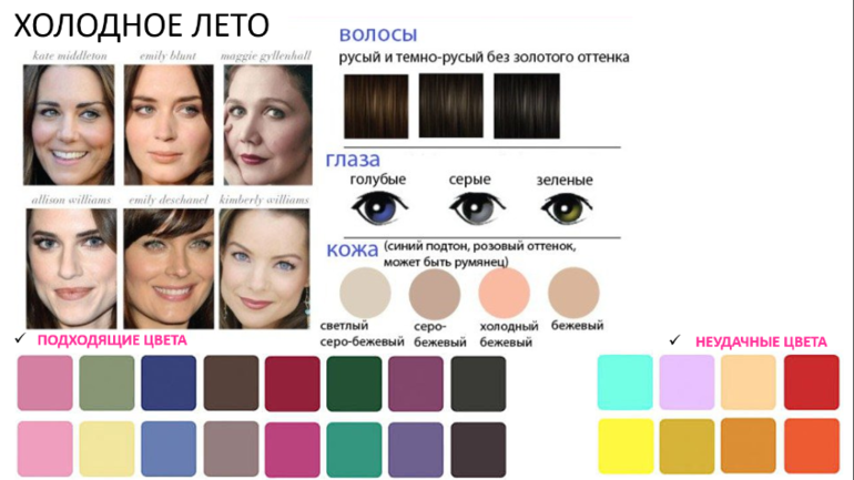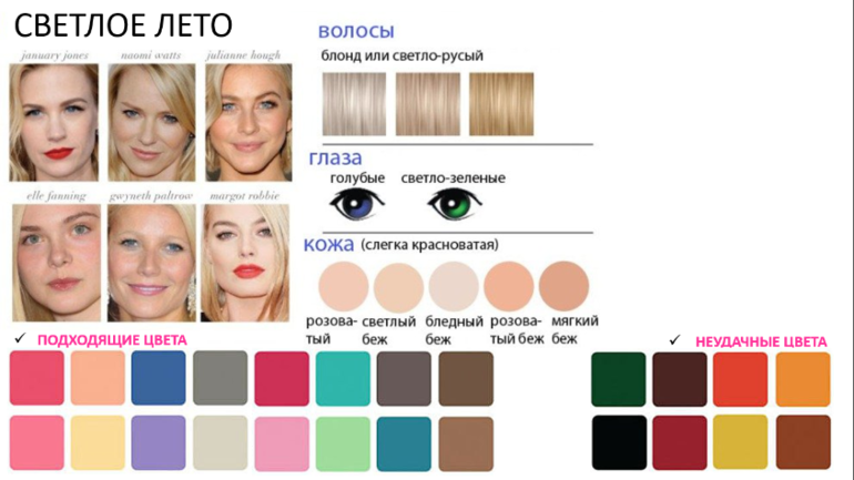 Это девушки со светлой кожей, хорошо поддающейся загару. - бежевой, розовой, сероватой. Волосы могут быть пепельные, русые или нежно-коричневых тонов. Глаза чаще всего зеленые, голубые и серые, но могут быть и карие. Это самый распространенный цветотип в нашей местности. Лето делится на Светлое, Холодное и Мягкое.