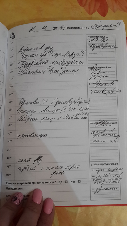 Я заглядываю в свой чудо КЖ вечерком или с утра - как есть время и силы. Смотрю - что сделал, что нет. Если что то не успела - не парюсь - переносим на другой день!И если получается, то в воскресенье вечером - тогда я расписываю неделю - мне не сложно переписать БНП, Илюшкины кружки и занятия. Вообще, в моем КЖ, как и в вашем - независимо от выбранного формата, должно быть деление на ежедневные дела (to do листы, рутины), Еженедельные дела (БНП, ЕЧУ), Ежемесячные дела - здесь каждому месяцу выделен лист, где записывается - сезонная стирка, если какие то дела (врачи, например,) планируются через несколько месяцев и т.д. Кстати, сюда же я пишу все ДР - этот мой чудо Ежеднев еще и семейный календарь - Игорь знает про него, и когда надо, может заглянуть даже - когда ему на ТО можно записаться),)