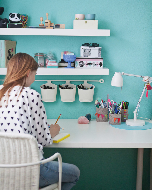 Нужно организовать рабочее место так, чтобы ребенку было удобно, понятно, комфортно. Тогда он будет и уроки делать с большим желанием и творить будет не на полу или на ковре, а за столом. Для этого максимально освободите поверхность стола, чтобы было пространство для работы. Уберите канцелярию в верхний ящик стола. Если ящиков нет, можно использовать пространство на стене, подойдет рейлинг или панели, куда крепятся все возможные принадлежности. Полки над рабочей зоной, дополнительная этажерка с ящиками обеспечат вас дополнительными местами для хранения. Вертикальные органайзеры или лотки для бумаг подойдут для хранения рисунков, тетрадей. Главный критерий - удобство.