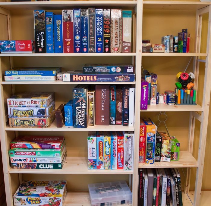 Коробки с настольными играми и книги можно разместить на полке в стопку или вертикально в органайзере. Пазлы для экономии места можно из коробок пересыпать в зип-пакеты, вставив туда картинку пазла в собранном виде. Можно использовать прямоугольный подвесной кофр.