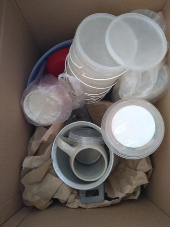 Пока не выбросила, сложила в коробку- надо подумать ещё, можно ли из этого что то оставить. Там огромные салатники и куча пластиковых контейнеров.