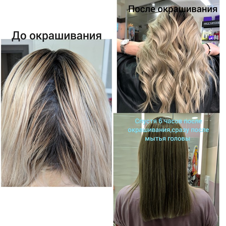 Как Вам???естественно, я не видела как меня подстригли, т.к. после Стрижки и сушки мастер стал завивать кудри (я так понимаю, что кудри скрывают КОСЯКИ горе-колористов, горе-стилистов). Честно признаться, увидев себя в зеркале, мне не очень понравился результат (было много серого, чего я не хотела видеть), но подумала о том, что это подсмоется и все будет Гуд. Естественно, наделал мне кучу фото моих прекрасных волос, с разными фильтрами (фото справа, вверху)...вообщем, уехала я домой с непонятным настроением... А дальше интересней... Дома, что-то мне подсказало, посмотреть ещё отзывы про этого мастера ( до прихода к нему, так же искала отзывы, но не нашлось). И мои Боги!!!! Нашла, 1 негативный отзыв... Клиентка была недовольна покраской.. После мытья головы, ее волосы были всех цветов радуги... И тут у меня закрались сомнения... В 00:35 пошла мыть голову и сушить...Результат виден на предыдущем фото внизу, справа...