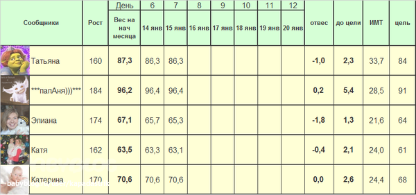 Отчеты-результаты (только для модераторов)Всем Приветик!!!У меня настроение о(Результаты не очень(вообще не понимаю, что происходит(((уже два дня килограмм один ходит туда-сюда в течение дня(((Может тк много воды пью и тк еще занимаюсь в тренажерном и растет мышечная масса???Ну, энтузиазма это не добавляет((((Вчера вообще мало ела, а вес 63,3(+200)