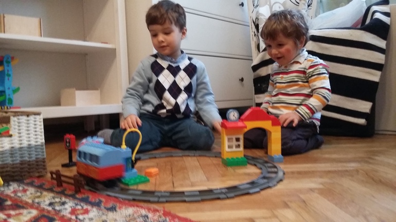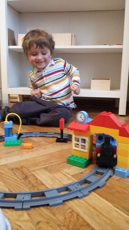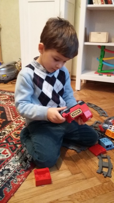 По рельсовой дороге поехал поезд, да какой! Он издает звуки, как настоящий поезд! Двухлетиний Николушка от радости стал хохотать, даже запрыгал на месте, а потом и вокруг дороги. А позже уже сидя танцевал.