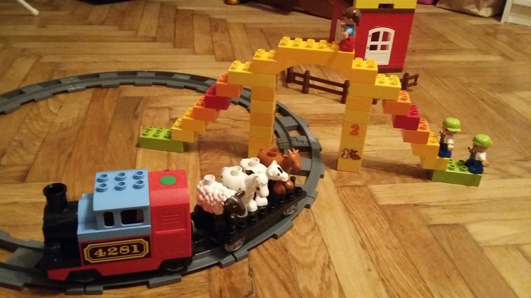 Но игра продолжается. Теперь это не пассажирский поезд, а сельскохозяйственный, который везет животных с фермы. Но где найти терпение долго строить большой дом, когда нужно скорее доставить животных на место назначения, да еще и установить мост для пешеходов.