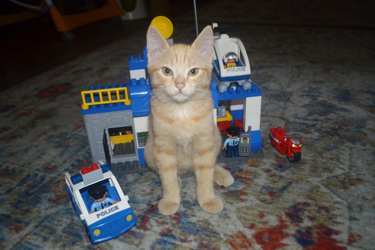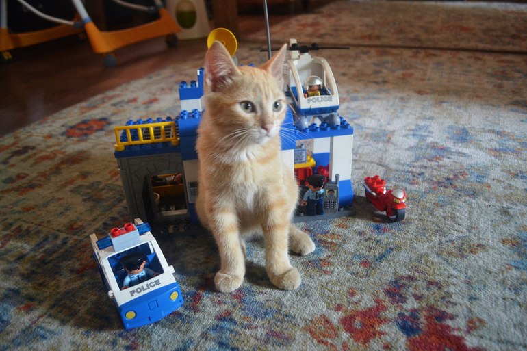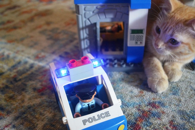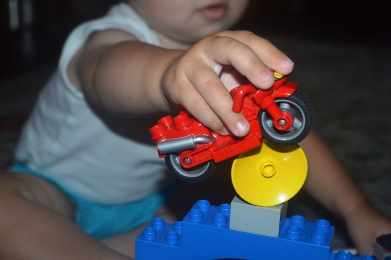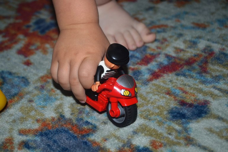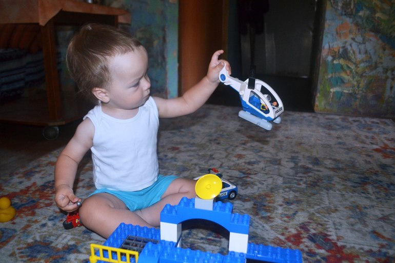Понятно, что старший сын, когда получил игрушку в подарок, был уже в том возрасте, когда дети хорошо играют в сюжетно-ролевые игры, младший пока еще не очень хорошо понимает суть игры, но уже пытается, катает машинку и мотоцикл друг за другом, садит человечков в транспорт и здание, ему очень нравится мигалка))) кубики лего младшему сыну удобно брать в ручку, он их достаточно легко соединяет между собой, примерно с года!