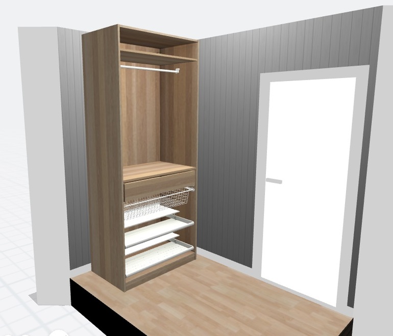 А вам обязательно полки именно под обувь?У меня в прихожей стоит Пакс. Думал туда полки под обувь делать. В реале посмотрела, маленькие они по объёму и не удобные. Сдала просто полки и купила коробочки под обувь там же в Икеи. Так больше влезает.Или вы хотите сразу с улицы ставить? Тогда не подойдёт, она там не проветривается и грязи много будет. Выдвижные штанги для верхней одежды не подойдут. Максимум влезут две демо куртки или одна зимняя. У меня выдвижные на мои костюмы и платья. И то не очень удобно.Корзины и ящику выше 100-120 см уже не удобно. Из них неудобно доставать, вещей не видно.