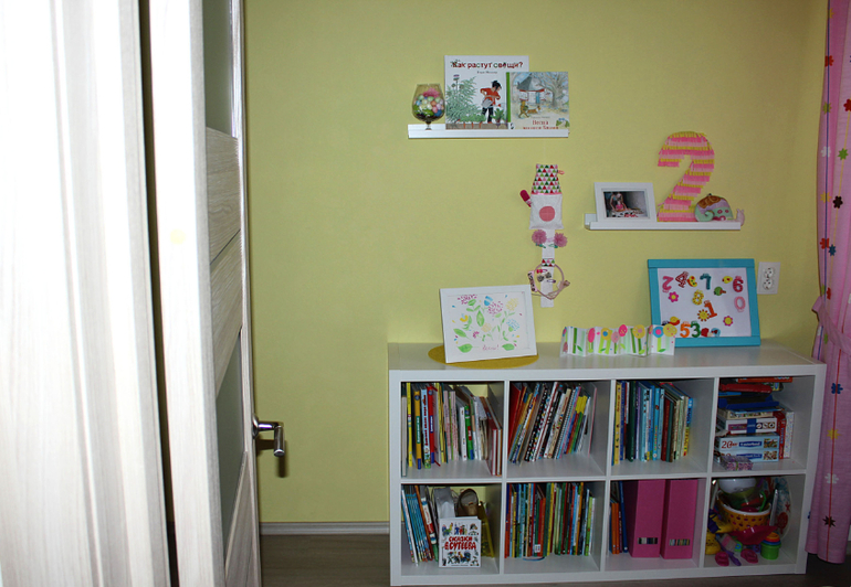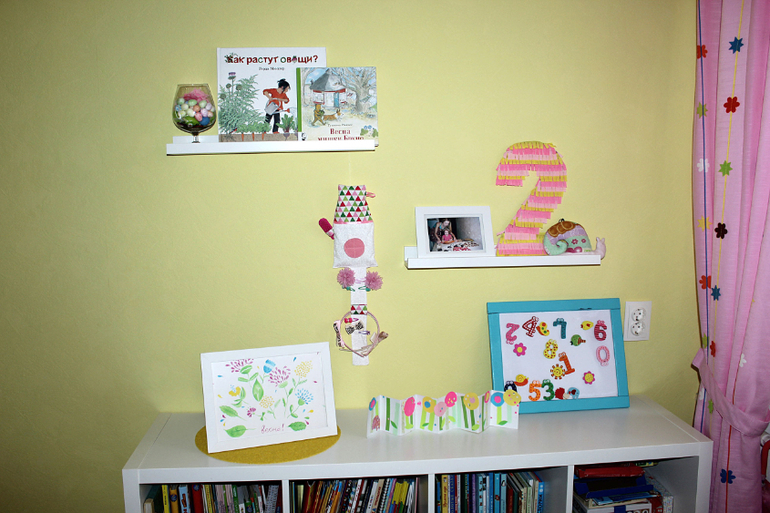 Поближе. На стеллаже у нас творческие работы, поделки, на полках книге по тематике или фотографии. Наполнение часто меняется.