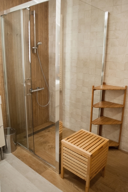 Тот же вопрос. Плитка под паркет? Паркету и ламинату через пару походов в душ ...Да и стена к которой прикреплен смеситель с ручным душем...гм грибок и сырость обеспечена.А в остальном нормально.