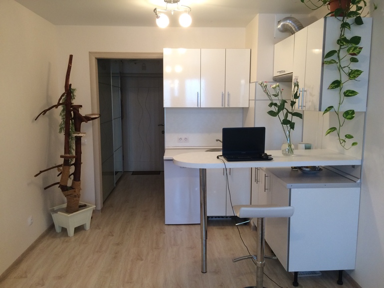 Нужен советДД, затеваю ремонт в крохотной студии, кухня будет полностью меняться, скорее всего, так как то, что сейчас, просто банально неудобно, от барной стойки откажусь точно. Чисто визуально не нравится, как висят шкафы, дробят стену на много частей, думаю вешать шкафы до потолка (вообще не вешала бы их совсем, но пространства тогда совсем не останется) и по потолку к левой стене над аркой тоже вешать полки типа бесто.