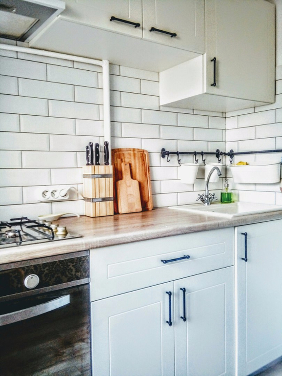 Очень стильно! Первое фото как из каталога) И обои изУмину определенную придают! Хотя, конечно, дело вкуса) у самой на двух квартирах белые икеевские кухни, очень довольно, что с какой-нибудь марией не связалась. Я бы на вашем месте еще дсп-панель/фасад ящика приделала над вытяжкой трубу закрыть