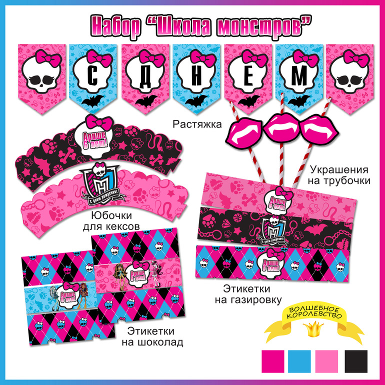 Оформление праздников, аксессуары для фотосессийВаша дочка любит мультик "Школа Монстров"? Тогда подарите ей незабываемы праздник с помощью нашего набора! В набор может входить множество других элементов и игр.