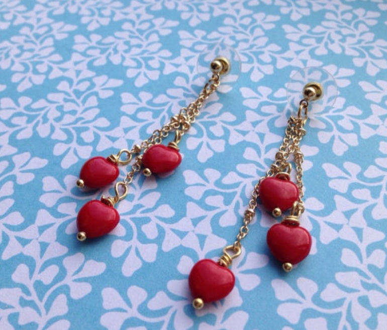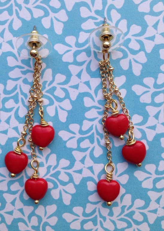 Бижутерия, броши, аксессуары для волосочень яркие и веселые сережки :) красные сердечки прикреплены к позолоченным цепочкам разной длины.