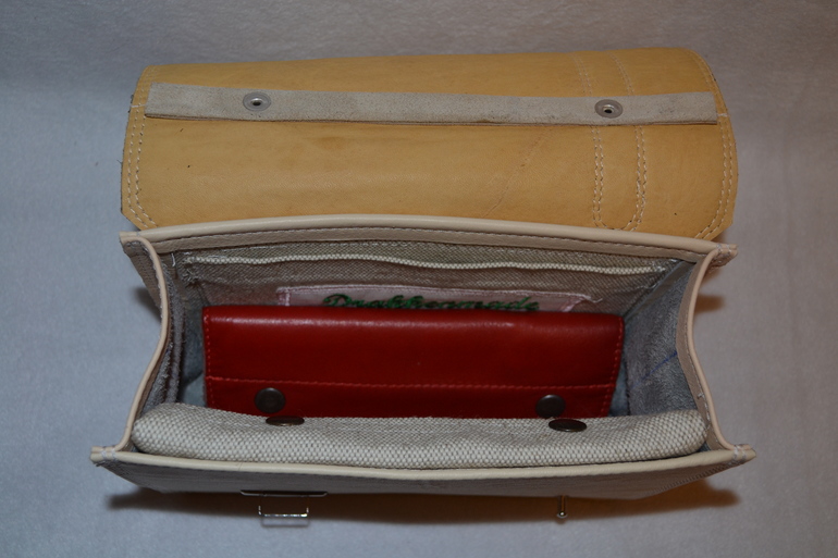 Ручка усилена металлической пластиной, спрятанной в кожаном чехле.