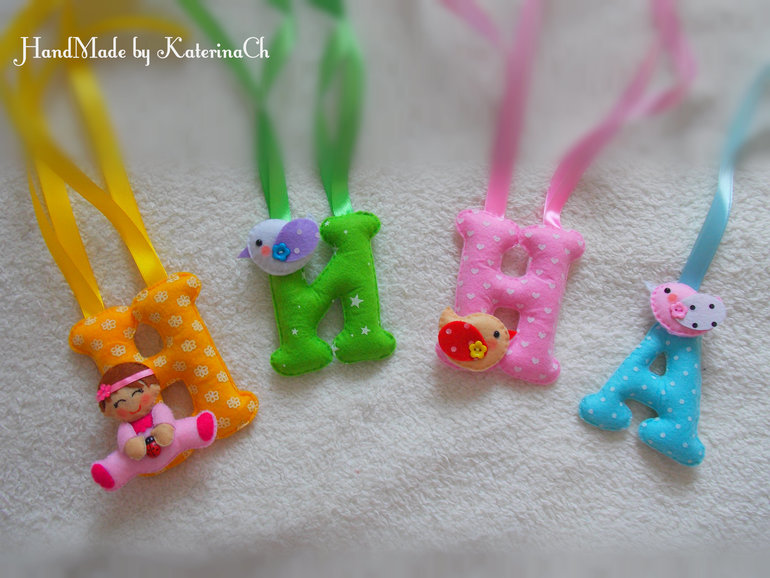 Пошились для Елизаветы и её доченьки Ниночки. Высота буковок 10 см. Украшены фетро-игрушками: малышкой и птичками.