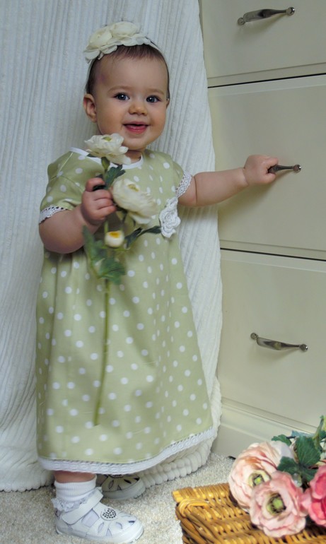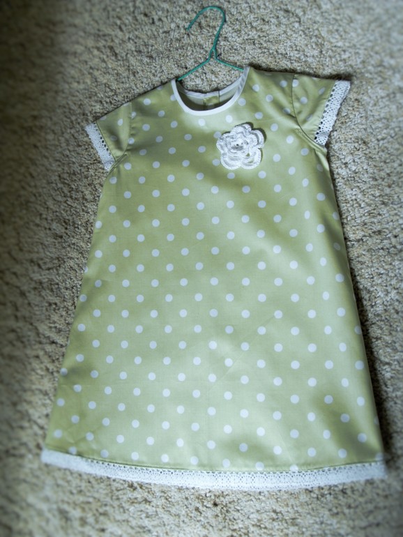 Платье для девочки из сатина (100% хлопок) светло салатового цвета в белый горошек. Отделка - нежное белое хлопковое кружево. Цветок связан крючком. Платье сшито без подкладки специально для жарких летних дней. Застежка на спинке (6 белых пуговиц). Платье расстегивается полностью, что позволяет быстро и удобно надевать его на ребенка.