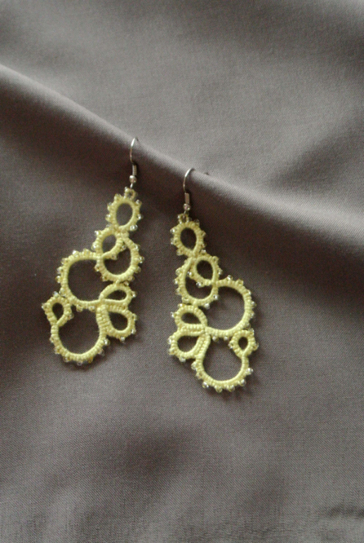 Кружевные серьги ручной работы нежно-желтого цвета выполнены в технике узелкового кружева фриволите. Прекрасно подходят к летнему гардеробу. Для работы использованы хлопковая нить и чешский бисер preciosa. Цена 600р. Отправляю в любой город.