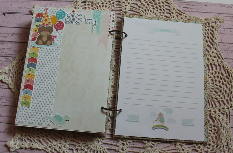 .Пухленький,тяжеленький-потому что много -много всего там есть для ведения записей о первом годе жизни малыша! :)Главное пожелание мамочки было это бежево -коричнево -голубая палитра по возможности- надеюсь я справилась,даже колечки коричневые нашла в запасах:)) Скоро полетит в новый дом!