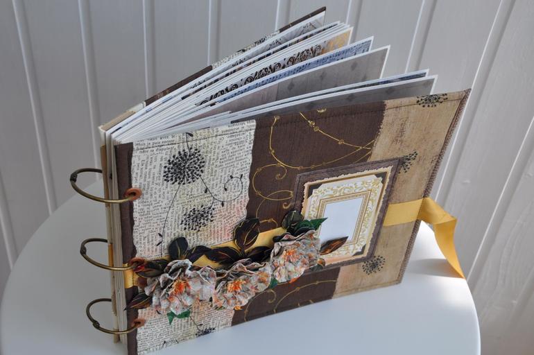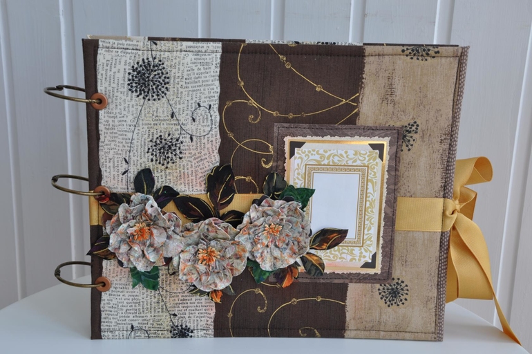 Альбом под самозаполнение. Вам останется только купить уголки для фото или вырезать подложки и пробить в них уголки. а также немного декорировать. Думаю, что есть немало творческих людей, которые хотят поскрапить, но не хотят влазить в это хобби по-серьезному. Такие базовые альбомы я делаю все время, Они не дорогие и пользуются хорошим спросом. Тематика может быть любая.На бумаге не экономлю. Здесь есть и золотое тиснение и глиттер. Ткань амер. хлопок с золотыми завитками.