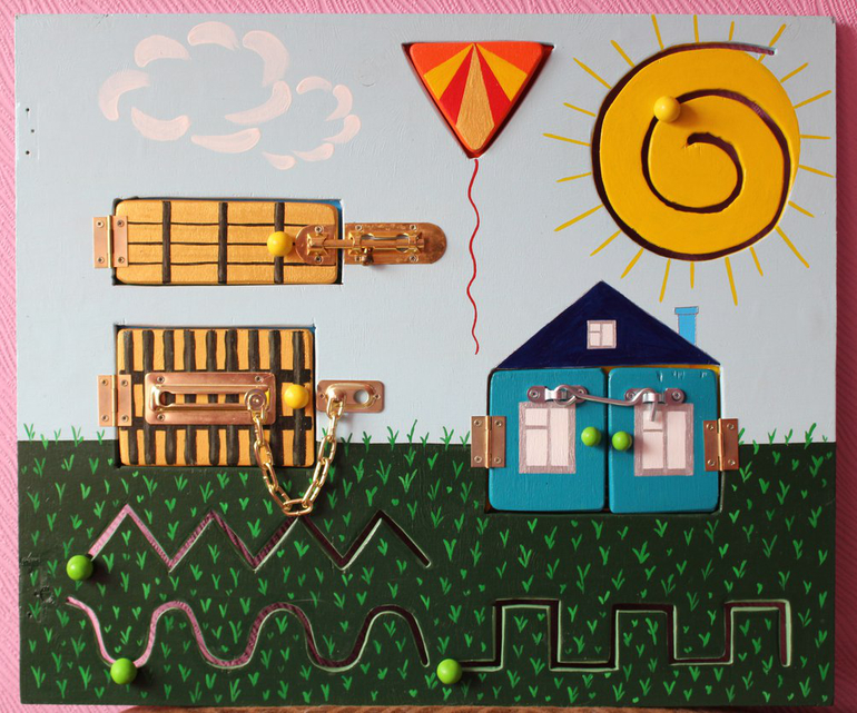 Развивающая доска (busy bord) 49*58 - прекрасный подарок вашему малышу, который будет не только интересным, но и полезным. Модуль сделан по методике Монтессори. Игровая часть с замками предназначена для развития мелкой моторики, понимания ребенком причинно-следственных связей, освоения алгоритмов открывания и запирания различных бытовых замков. Так же за дверцами спрятаны разные животные, что делает игру не только более интересной, но и способствует развитию речи. Игровая часть с прорезями позволяет ребенку совершенствовать фиксированные непрерывные движения рукой, имитирующие письмо, вращательно-поступательные движения кистью и движения пальцем по направляющим бороздкам. Это послужит развитием руки ребенка и подготавливает ее к письму. При этом задействуются оба полушария что способствует развитию творческих и логических, точных навыков. Яркий дизайн модуля не оставит никого равнодушным!