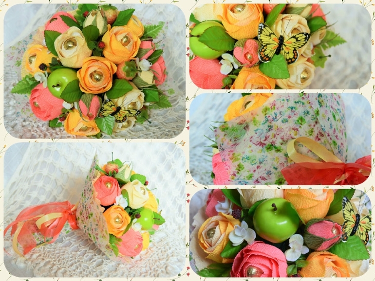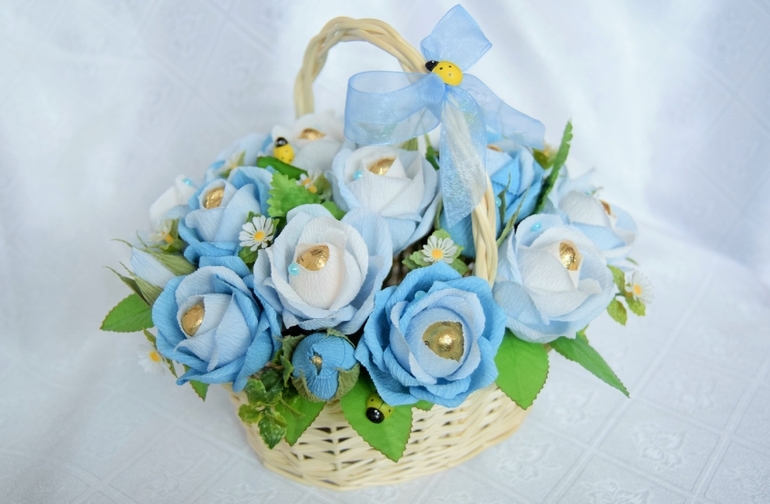 Все конфетки легко вытащить, некоторые букеты дополнены чаем. Композиции в корзинах можно упаковать в прозрачную пленку, в любом случае букет поставляется в бумажном пакете.