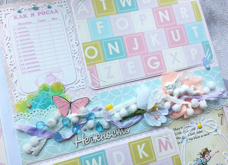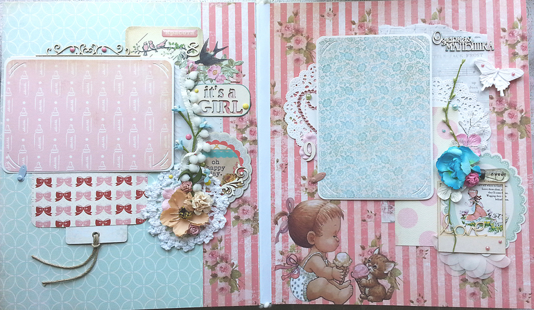 Всем привет! Сегодня покажу вам альбом для девочки на первый год.. Он получился очень внушительный, размер 25х30 см, 8 разворотов (16 страниц), книжный переплет, мягкая обложка из натурального хлопка. Имеется страничка с ожиданием малышки (с фото беременности и УЗИ), страничка о выписке из роддома, Моя семья и по 1 странице на каждый месяц жизни ребенка.