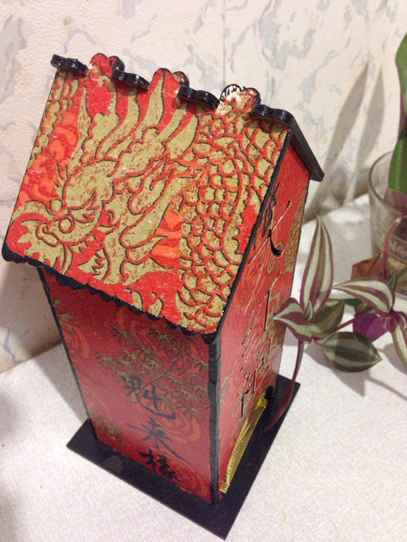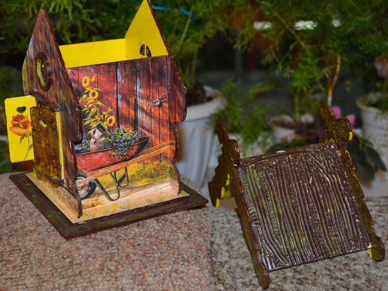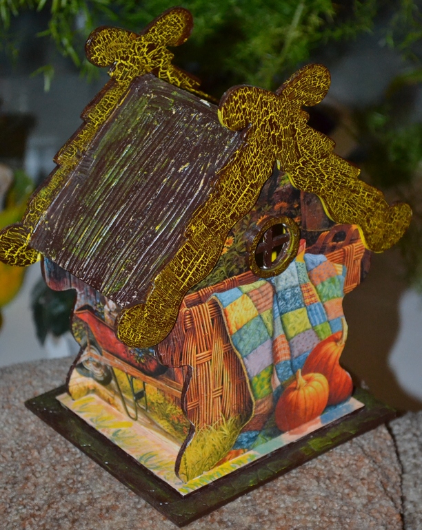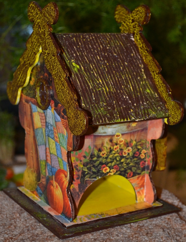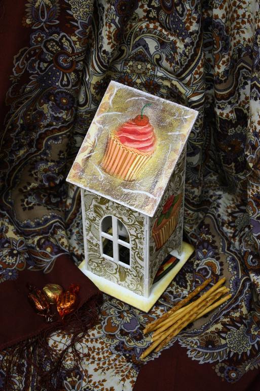 Сделан домик с применением декупажной карты и подрисовки, также присутствует яичный кракелюр (на подставочке) и шпатлёвка (на крыше), также на крыше применен и одношаговый кракелюр.