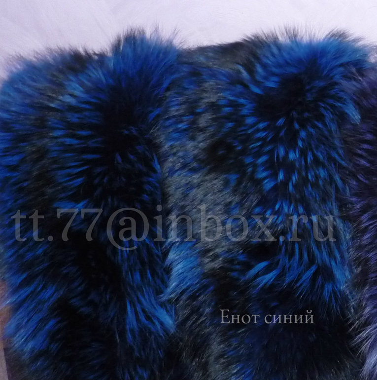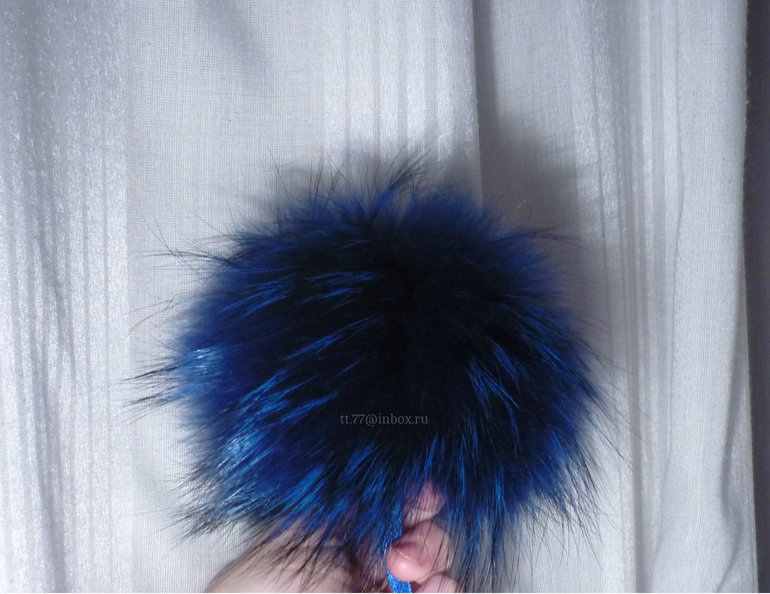Меховой помпон №00-0257. Енот. цвет синий. размер по перьям- 21см., по подшерстку - 14,5см. Цена - 1200р.