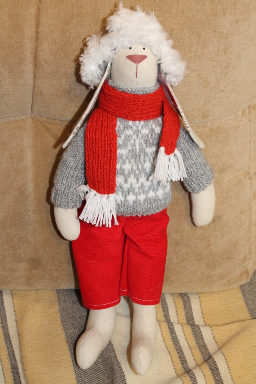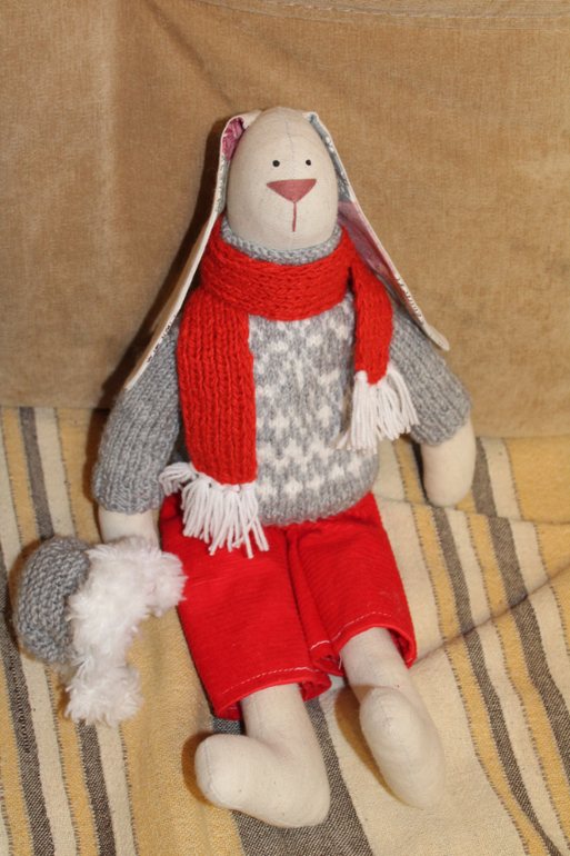 Куклы и игрушкиТильда зайчик Стильняшка) в уютном жаккардовом свитерочке, "революционных красных шароварах")))) шапке ушанке и с красным шарфом) Выполнен их хб материала. Уютный и милый ушастый зверь)