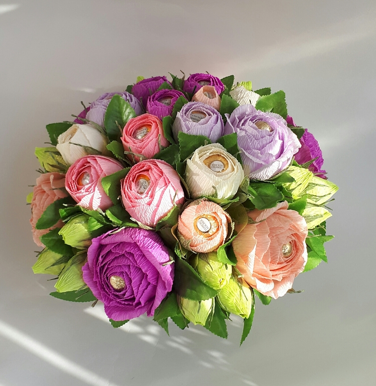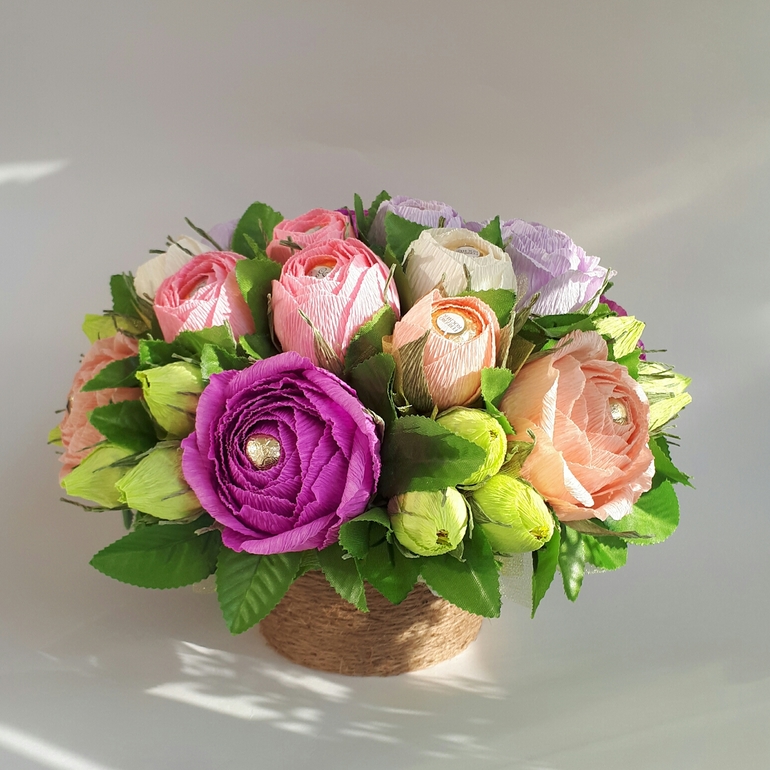 Предлагаю композицию в кашпо. Диаметр 26 см. В составе конфеты : Ferrero rocher , Золотая Лилия, Осенний вальс, Трюфель Оригинальный. Всего 39 шт. Упаковка - пленка с бантом. Цена 1400. Бесплатная доставка до любой станции метро. Есть бюджетные варианты.