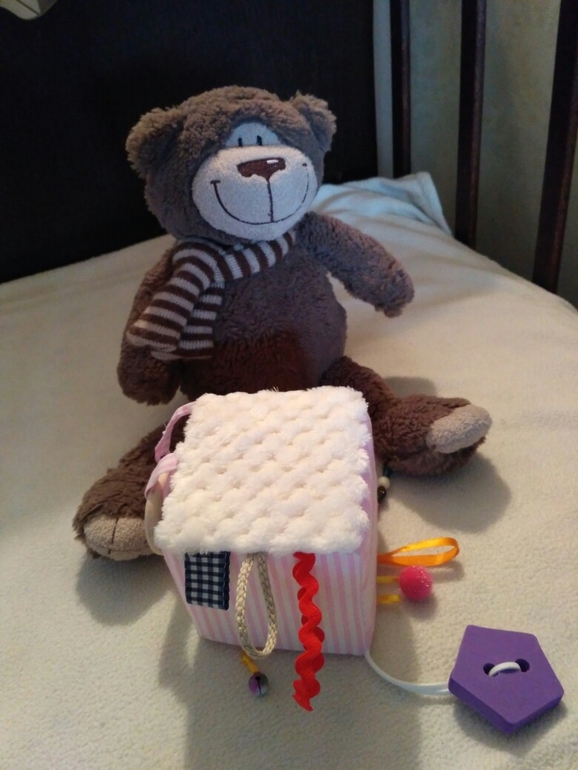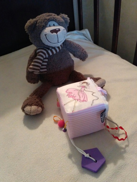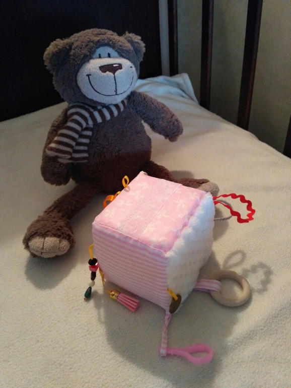 Кубик дополнен бусинами, деревянным кольцом, ленточками, грызунком и пр.